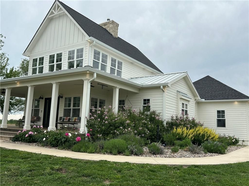 10 acres on blacktop ? a rare blend of modern comfort and full-function hobby farm living. Built in 2020 as the sought-after builders personal residence, this open-concept home offers 6 bedrooms, 3.5 baths and 4,032 total sqft with thoughtful finishes throughout.Main living features include a dramatic two-story great room with abundant windows, wide-plank white oak engineered floors, a see-through fireplace between the dining room and living room, and a chef-ready kitchen flowing to living and entertaining spaces. The primary suite is conveniently located on the main level and opens to a large screened porch that, together with the dining room, leads out to an expansive concrete patio ? ideal for indoor-outdoor living. Two oversized bedrooms upstairs include vanities/sinks plus a full upstairs bath; three additional bedrooms are located below grade. Practical comforts: main-level and basement laundry, an oversized two-car garage, and a large finished six-sided concrete storm shelter.Outdoor and outbuilding amenities are built for hobby farmers, equestrians, and weekend hosts. Approximately 2.5 acres are fenced and improved with a horse barn that has power and water. The back 5 acres serve as productive hay pasture. The 2,400 sqft barn/shop includes a 1,600 sqft insulated, heated & cooled shop space with two overhead doors and a full bath, plus an 800 sqft one-bedroom apartment with kitchen/living area, full bath, W/D hookups and a wraparound covered porch ? perfect for rental income, guest quarters, or on-site help.Additional property highlights: chicken coop with power, water and indoor/outdoor access; raised-bed garden area with water run; a 33-ft above-ground pool with deck and awning for summer entertaining; and abundant acreage for riding, gardening, or expansion.Location is exceptional ? just one mile from the new elementary school in the award-winning Basehor-Linwood School District.