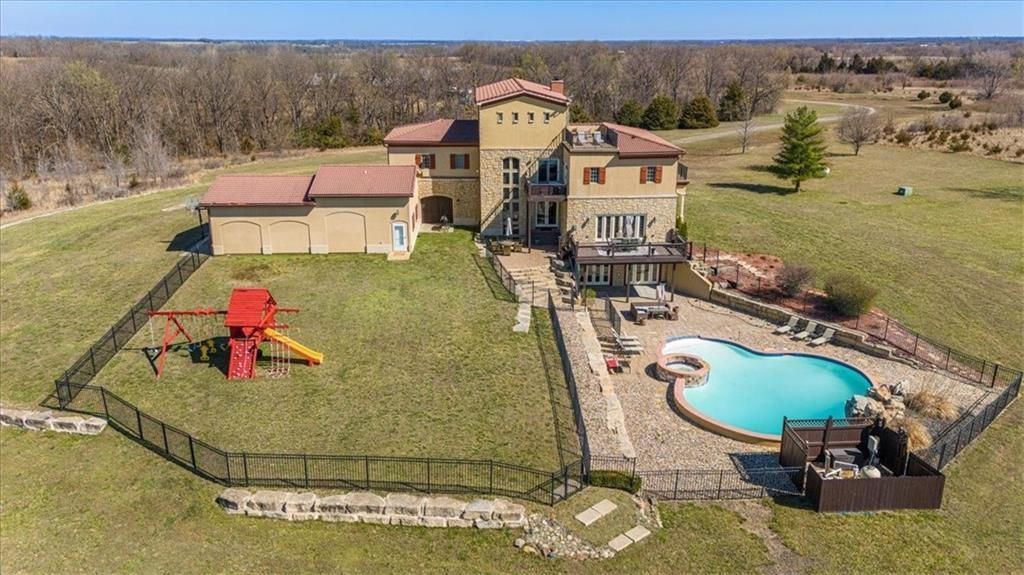 Welcome to 2343 N 600 Road, Edgerton, KS, 26.64-acre private estate blending luxury, privacy, and natural beauty. Behind the gated entrance, a tree-lined drive leads to this European Villa-inspired residence, featuring 6,491 sq ft, 5 bedrooms, 5 full and 2 half baths. The grand entryway opens to stunning interiors with soaring ceilings, arched openings, and exquisite finishes. The gourmet kitchen boasts granite countertops, custom cabinetry, double ovens, a pot filler, two wine fridges, and a butlers pantry, flowing into the hearth room with a stone fireplace, exposed beams, and a wall of windows. The formal dining room with stone flooring and a custom chandelier provides an elegant gathering space, while expansive decks and patios showcase breathtaking views of the pool, pond, and rolling landscape. The primary suite is a serene retreat with vaulted ceilings, private deck access, and a spa-like bath featuring dual vanities, a whirlpool tub, and a walk-in shower. The lower level offers a spacious rec room, stone fireplace, built-ins, and two additional ensuite bedrooms with pool access. Outdoor living is unparalleled with a heated saltwater pool and spa, a private pond with an island, and manicured grounds teeming with wildlife. The 1,200 sq ft, 4-car epoxy-floored garage is a car enthusiasts dream, while the third-floor flex space offers endless possibilities. This one-of-a-kind property provides a secluded retreat just minutes from Lawrence, Overland Park, and the KC metro. Whether youre looking for a luxury residence, vacation getaway, or your own private oasis, this estate is a must-see.