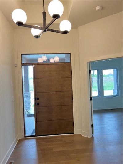 UPCOMING KCHBA 2026 Spring Parade of Homes Entry!The Chestnut reverse 1.5-story by Symphony Homes, LLC offers elegant main-level living with energy-efficient design in Archers Landing at Sundance Ridge. Now at the finished, this home features a walk-out lower level backing to wooded green space and a covered deck for outdoor enjoyment. The main level includes hardwood floors through the entry, great room, kitchen, and breakfast area, complemented by a spacious front porch with a suspended stoop?ideal for a future storm room, wine room, or additional storage. Photos shown are of a previously sold home to illustrate comparable finishes. Enjoy The Village amenities?clubhouse with fitness facility, gathering room, and a resort-style pool with rock waterfall and slide?in Blue Valley Schools. Conveniently located 11 min to Blue Valley High, 8 min to Price Chopper, 10 min to BluHawk, and 16 min to Heritage Park.