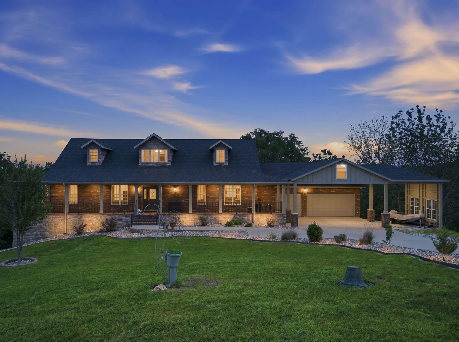 Tucked away on 6.6 private acres just minutes from Branson and Table Rock Lake, this expansive Ozark retreat offers seclusion, space, and convenience. A wraparound covered porch welcomes you, along with a 3 car garage, extended covered parking, and additional covered boat storage. Inside, the home features a spacious great room with hardwood floors, flowing into a formal living room, dining room with coffered ceilings, and a cozy hearth room. The kitchen is designed for gathering with dark wood cabinetry, granite counters, a large island with bar seating, stainless appliances, and tile backsplash, all connecting to an enclosed sunroom with vaulted ceilings and sweeping panoramic views of the surrounding hills. The main level features a spacious private bedroom en-suite with a tiled walk-in shower plus two additional bedrooms with a Jack and Jill bath. Upstairs, the primary bedroom serves as a true retreat with an attached office and a large en-suite bath offering dual vanities, a walk-in shower, and jetted tub. The walkout basement is ideal for multigenerational living with two additional en-suite bedrooms, a spacious recreation room, second kitchen, laundry, and plenty of storage. Outdoor living shines with low-maintenance composite decking, peaceful views, along with a storm shelter, chicken house with electric, 2nd shed already wired, and an RV electric hookup. This property offers privacy, flexibility, and the quiet lifestyle buyers seek while staying close to Table Rock Lake and Branson amenities.