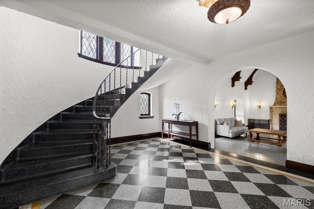 First showings at Open House on Sunday, 4/26 from 1-3pm. Along the iconic, tree lined stretch of Wydown Boulevard, where morning light filters through a canopy of mature trees and daily life unfolds with runners, walkers, and children heading to school, this distinguished Tudor residence introduces itself with quiet presence and enduring character. Set within Claverach Park and moments from Forest Park and the area's most celebrated dining, the setting reflects a rare balance of energy, tradition, and refinement within the Clayton School District. Inside, a gracious entry with sweeping staircase and terrazzo floors reveals the home's architectural pedigree. The living room is nothing short of dramatic, with a soaring beamed ceiling rising to nearly twenty feet, leaded glass windows, and a commanding stone fireplace that anchors the space. French doors open to a newly restored covered terrace, offering a natural extension of the interiors. At the heart of the home, the kitchen has been completely reimagined and recently featured in St. Louis Magazine, serving as a true centerpiece. Custom cabinetry, premium appliances, and meticulously curated finishes define the space, while hidden charging stations are seamlessly integrated for modern living. Historic elements, including sandblasted radiator cabinetry, have been thoughtfully preserved and reinterpreted. A refined palette complements the natural wood tones and terrazzo, while architectural ceiling detail and abundant natural light elevate both form and function, creating an environment equally suited for daily living and sophisticated entertaining.The dining room retains its original chandelier and sconces, offering a sense of timeless elegance with French doors that extend gatherings outdoors. The primary suite provides a serene retreat with generous closets and a beautifully appointed bath featuring dual vanities, a soaking tub, and a separate shower. Three additional bedrooms and two well appointed baths complete the upper level. The lower level offers flexible recreation and storage. As the home unfolds outward, its scale becomes even more compelling. Set on approximately three quarters of an acre, the grounds offer a rare sense of space and possibility, equally suited for quiet enjoyment or future vision. A gated drive leads to a two car garage with additional covered parking, reinforcing both privacy and convenience. Extensive improvements including full electrical replacement, new HVAC systems, slate roof updates, and historically appropriate tuck pointing ensure the integrity of the home for years to come.This is a property where architecture, setting, and lifestyle align, offering a timeless residence in one of Clayton's most storied and beautiful neighborhoods.