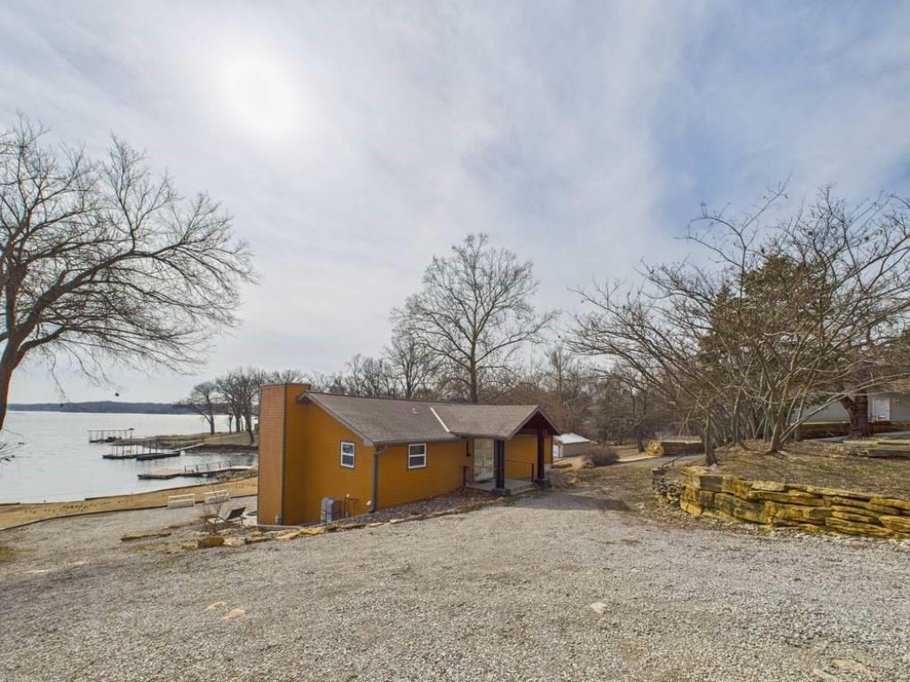 This stunning fully furnished home at Lake Fort Scott, boasts approximately 3,360 square feet of exquisite living space. Recently upgraded with a new roof, this residence features three spacious bedrooms and two full bathrooms, including additional plumbing prepped for a primary suite. The open floor plan on the main level showcases a vaulted ceiling, enhancing the airy feel of the living space, which is designed with modern aesthetics in mind. The large kitchen, equipped with a quartz kitchen island, features a professional-grade Viking gas range with pot filler and stainless steel hood. Cozy up by one of the two electric fireplaces or step out onto the covered deck from the main level, perfect for entertaining. The lower level includes a family room and a media room, as well as a workout area with included equipment. Additional amenities include a side entry garage with a utility cart, a large back patio, and a private dock with a 22-foot Sun Tracker pontoon and a lake-side outdoor fire pit. Conveniently located just an hour and 15 minutes from the metro KC area, this home offers a perfect blend of luxury and leisure.Fort Scott Lake has a yearly $150 lake frontage fee and monthly sewer fee due to the City of Fort Scott