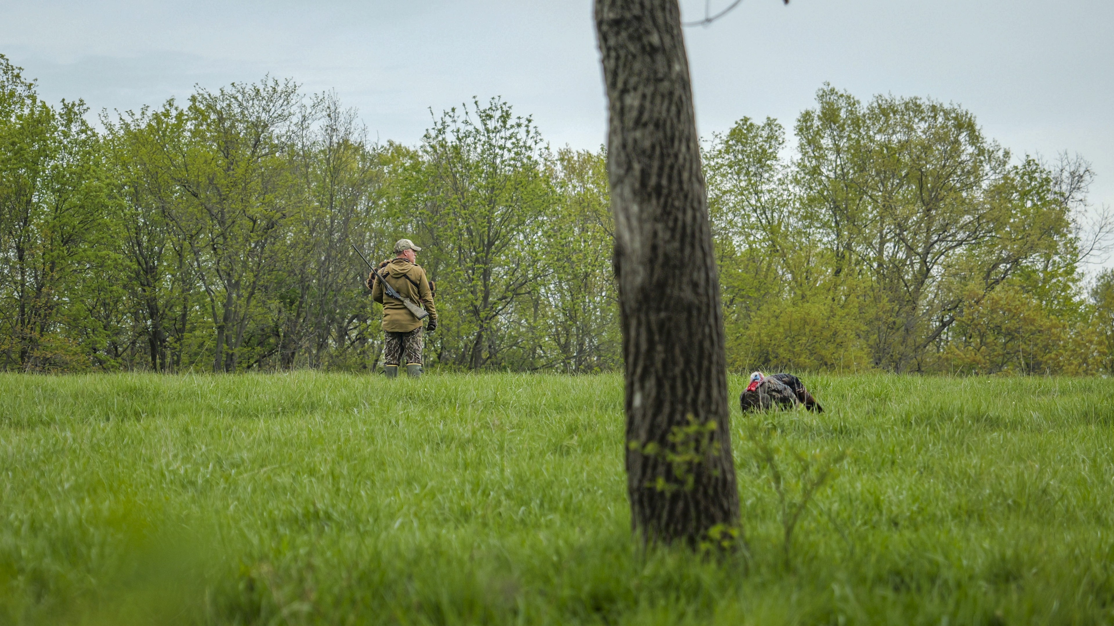 2. It gives you concealment and visibility. Sit against a tree wider than your shoulders — this breaks up your outline and protects your back. You want to see the bird before he sees you, which means being in a position where you can scan open ground. Don't bury yourself in brush so thick you can't see fifteen yards.